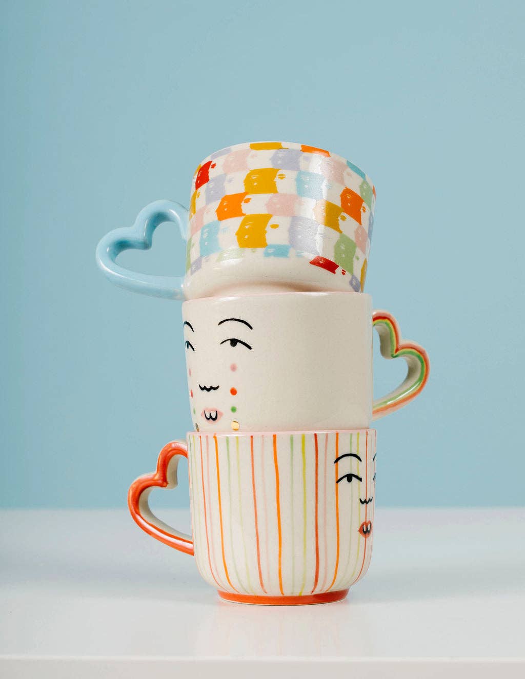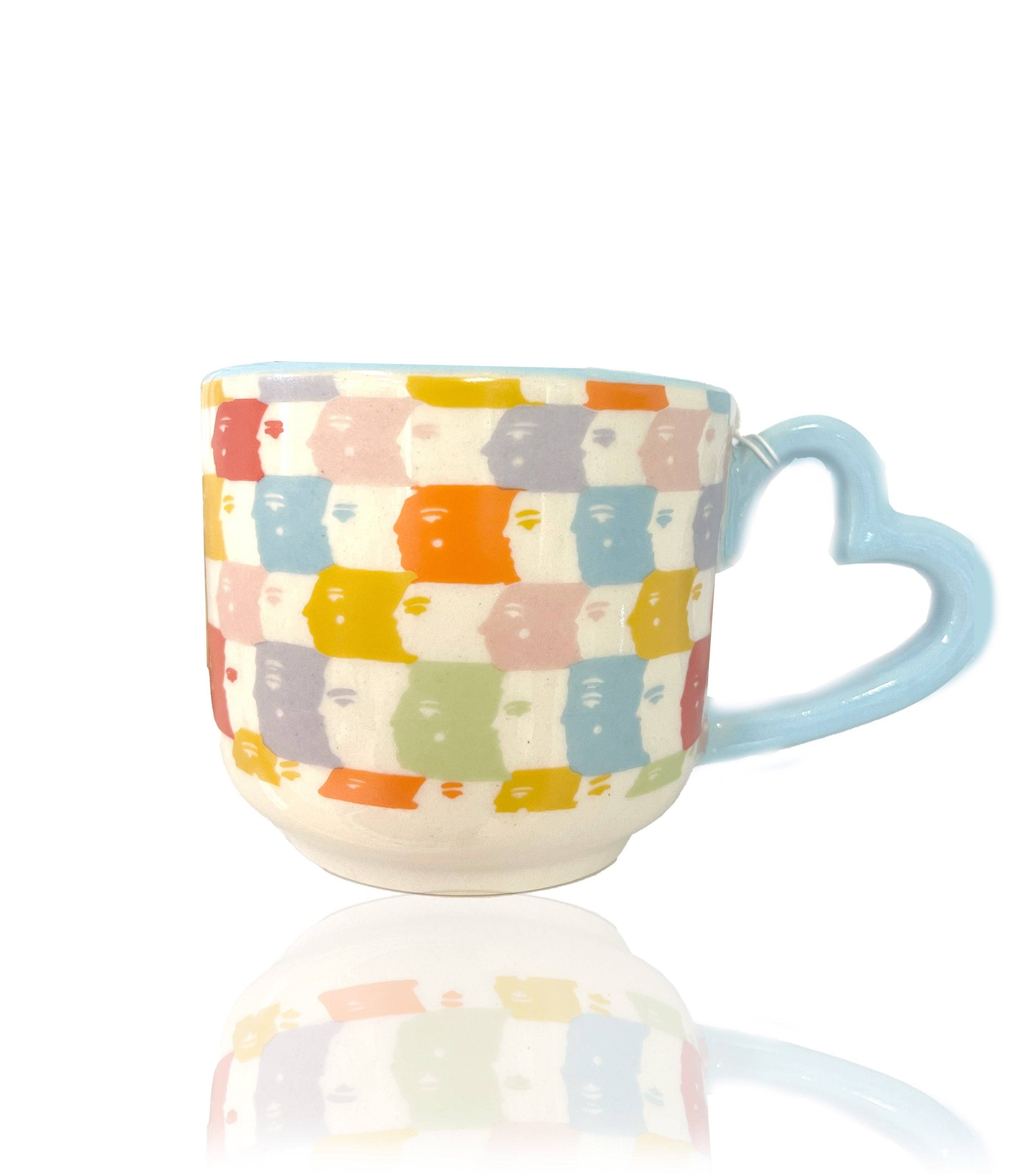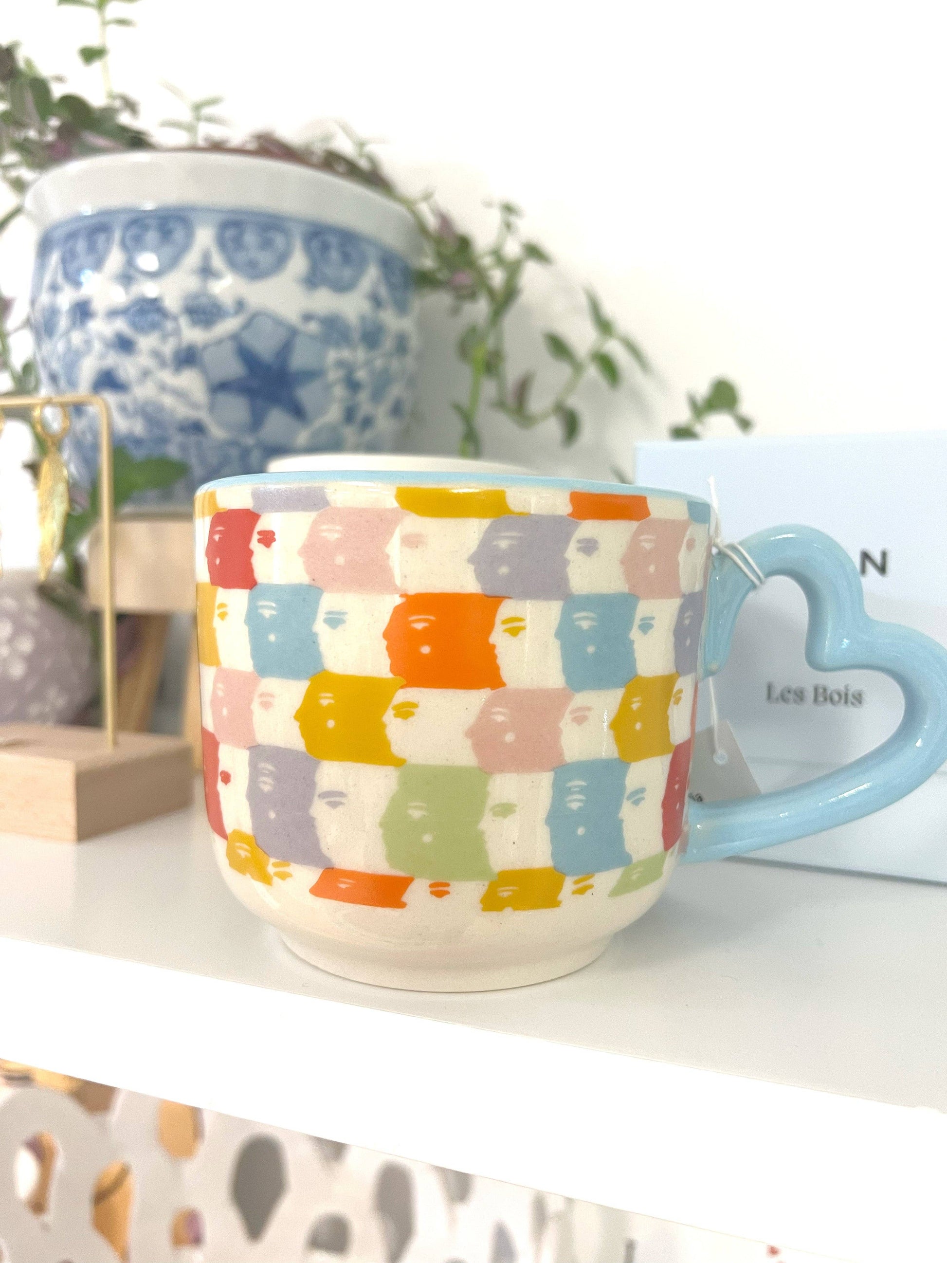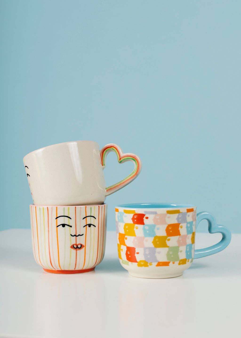 Designed in-house at My Little Belleville, these mugs are a colorful way to sneak in a bit of personality into your life. A rainbow pattern of face profiles decorate the outside, with a pretty vintage eggshell blue inside and on a heart-shaped handle. Durable and made in India. Details: 5X4 inches Microwave and dishwasher safe.