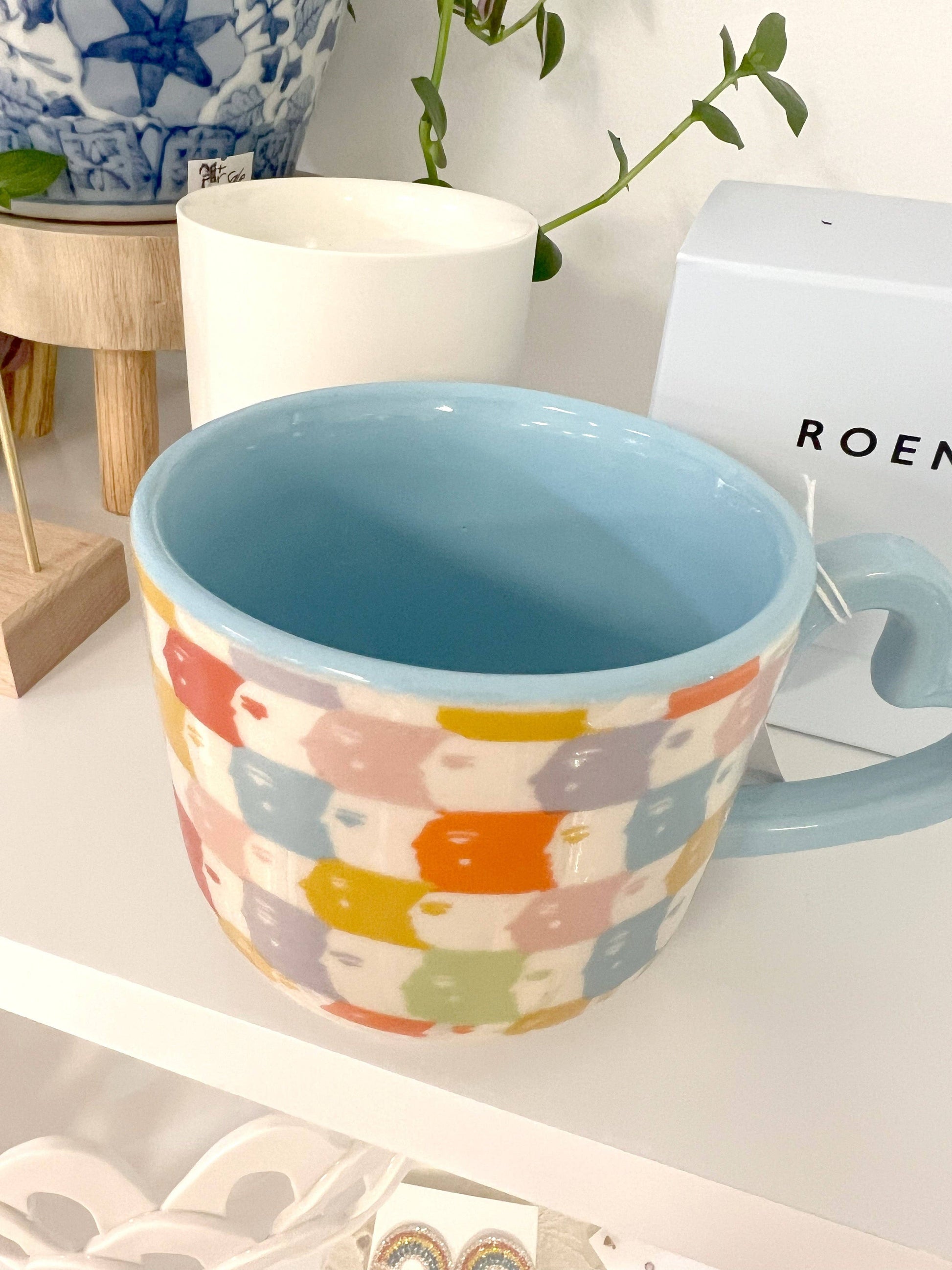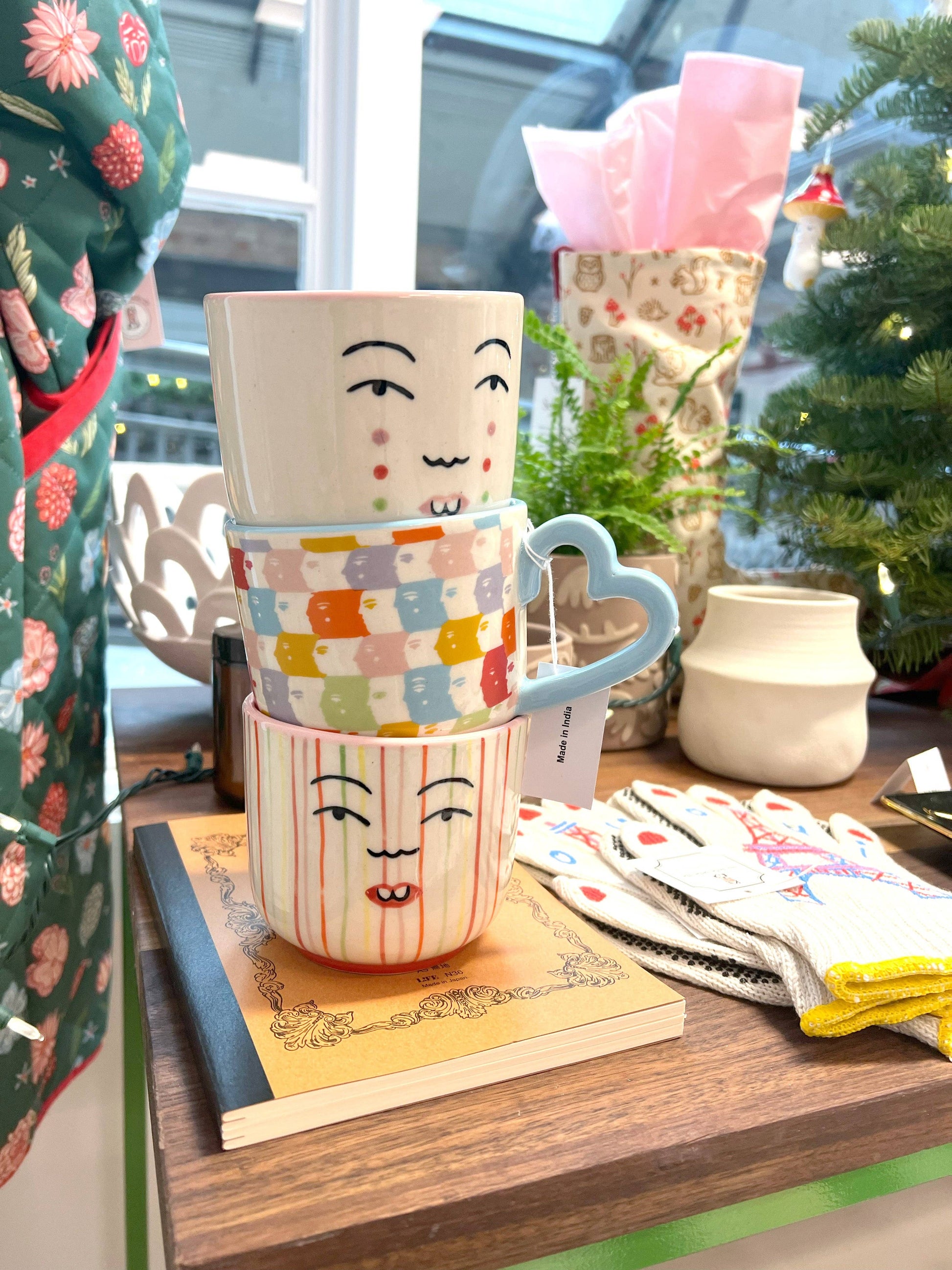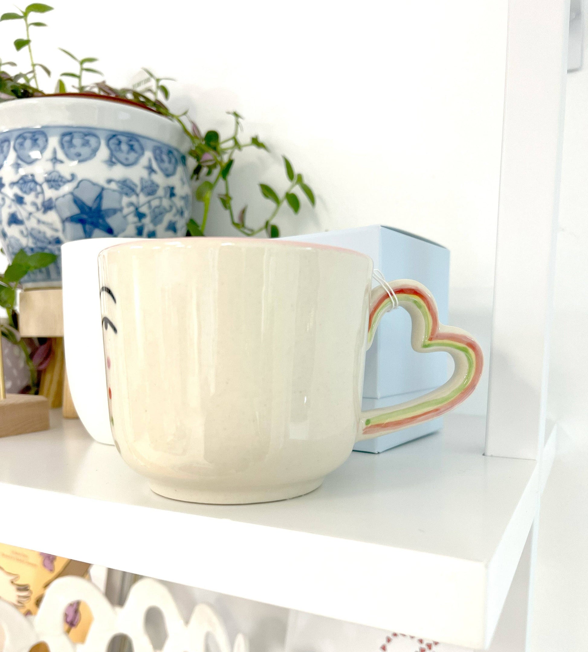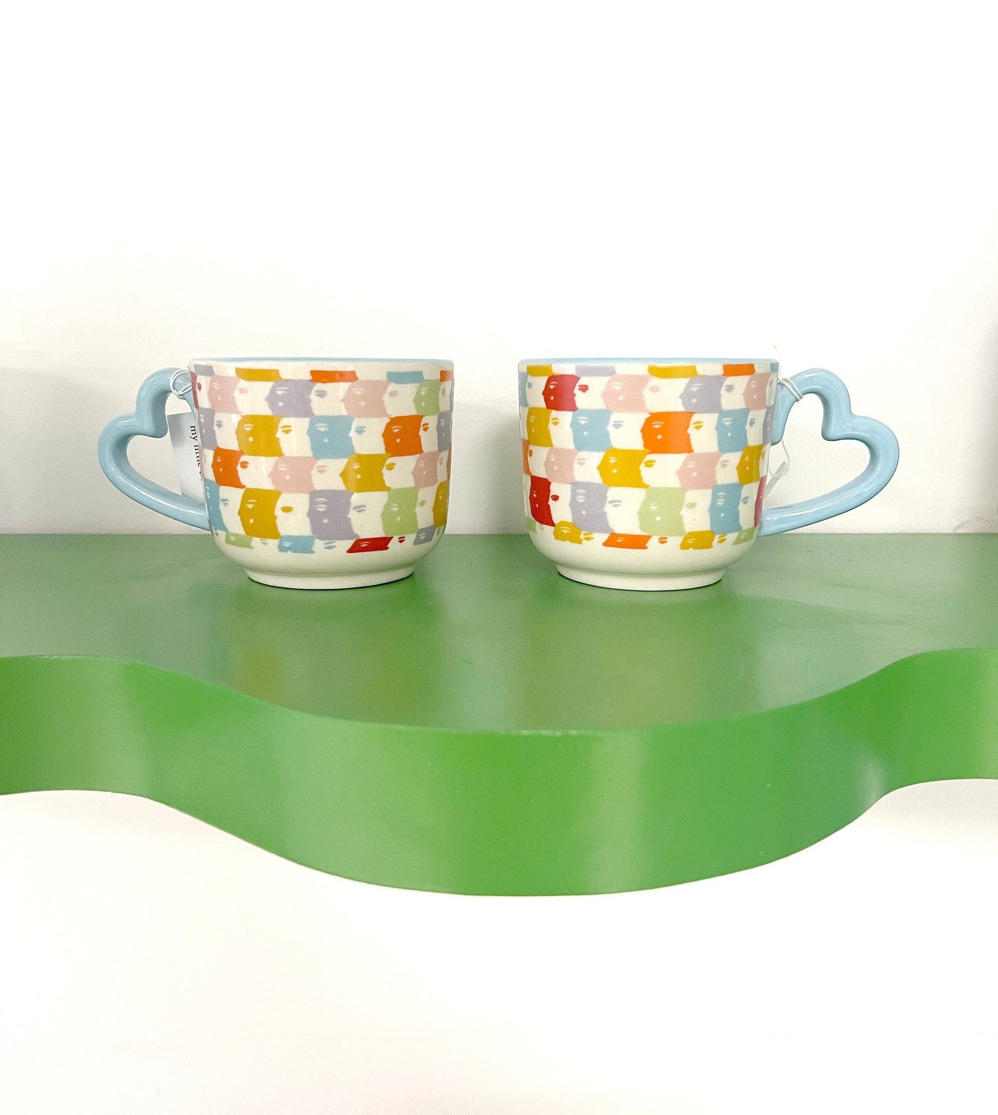 Designed in-house at My Little Belleville, these mugs are a colorful way to sneak in a bit of personality into your life. A rainbow pattern of face profiles decorate the outside, with a pretty vintage eggshell blue inside and on a heart-shaped handle. Durable and made in India. Details: 5X4 inches Microwave and dishwasher safe.