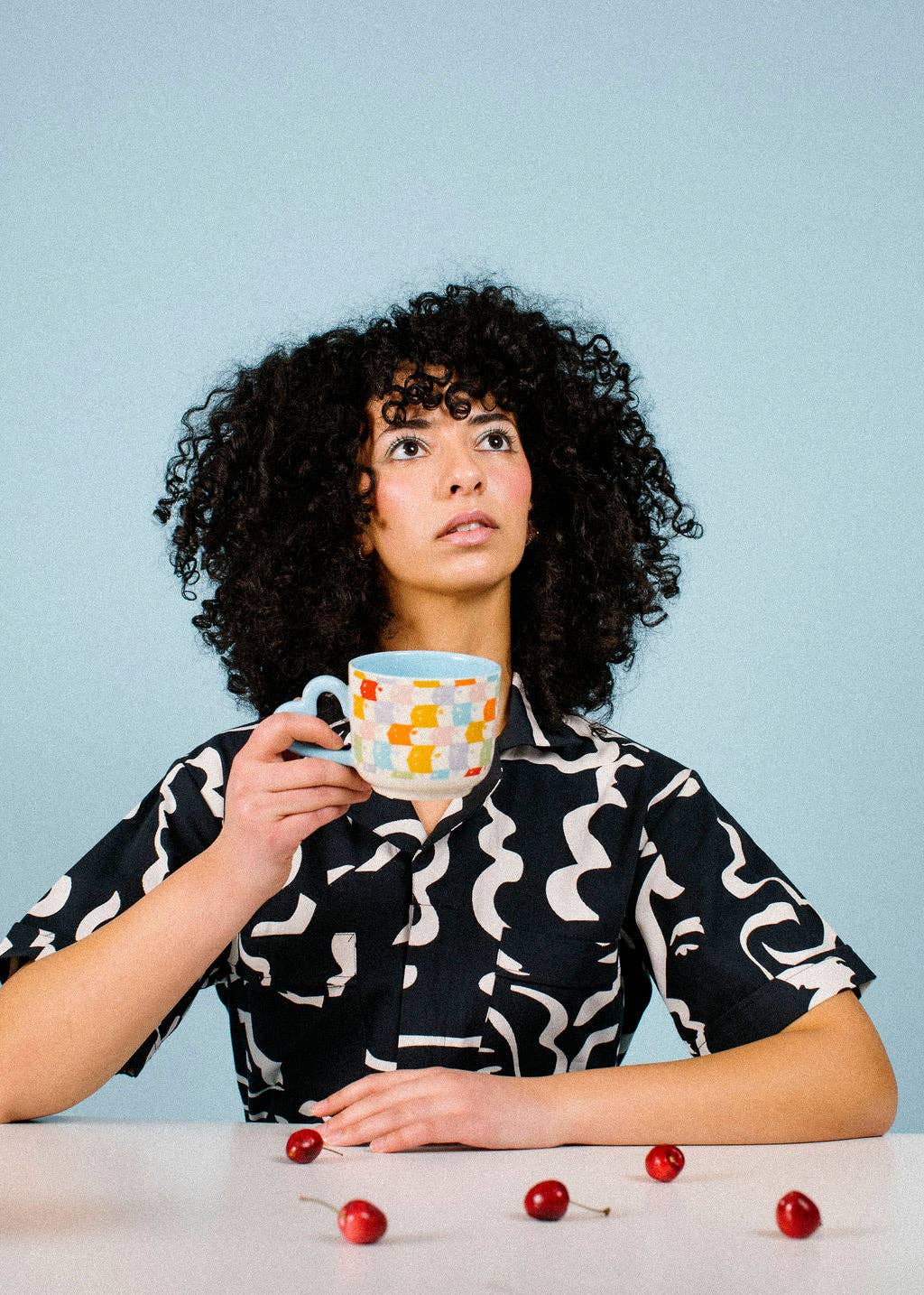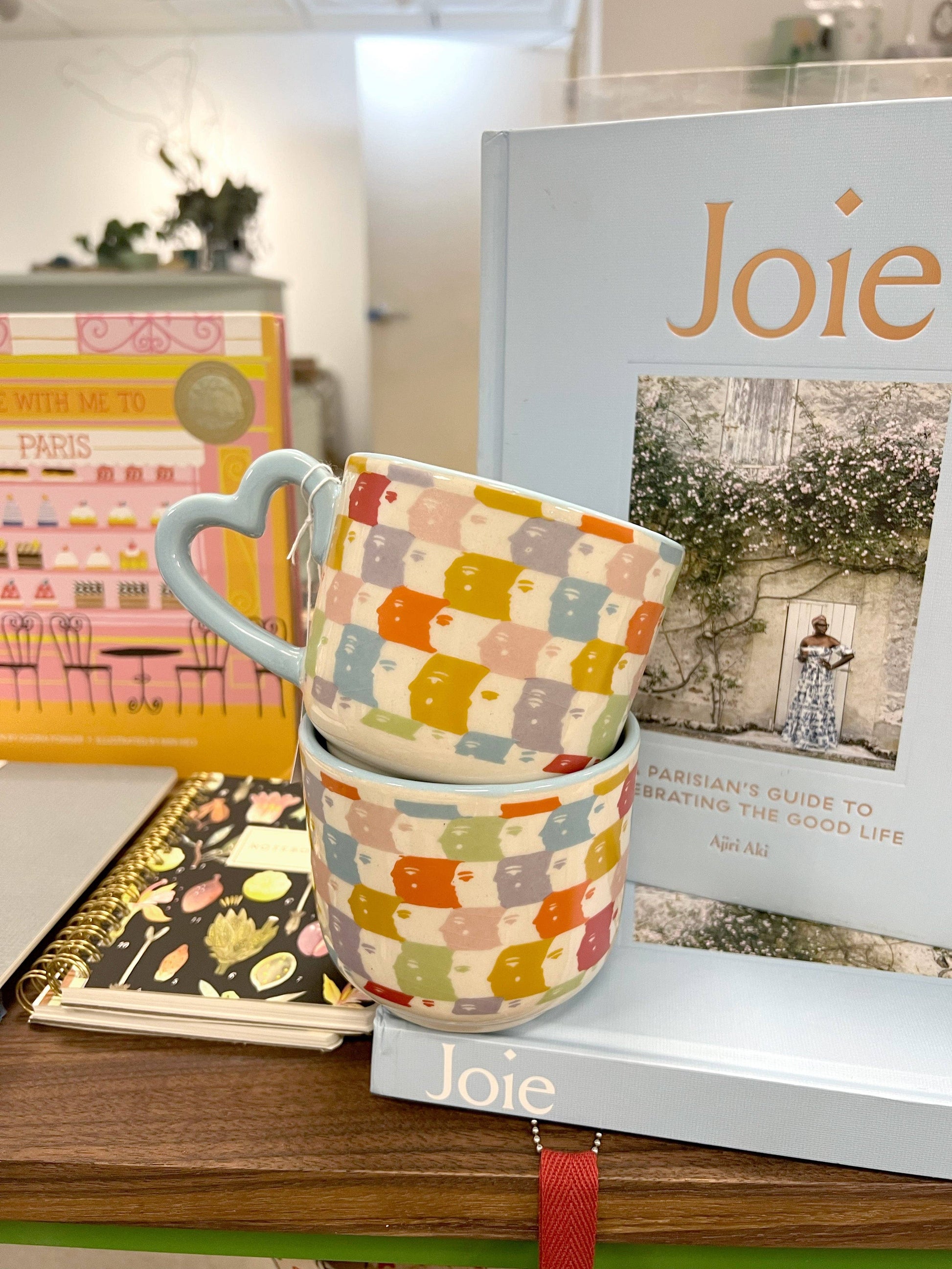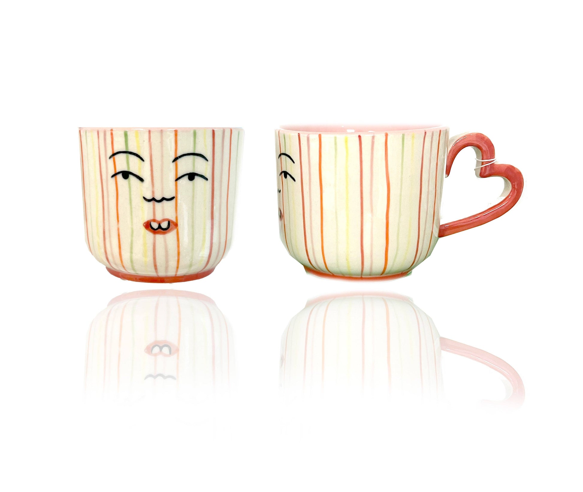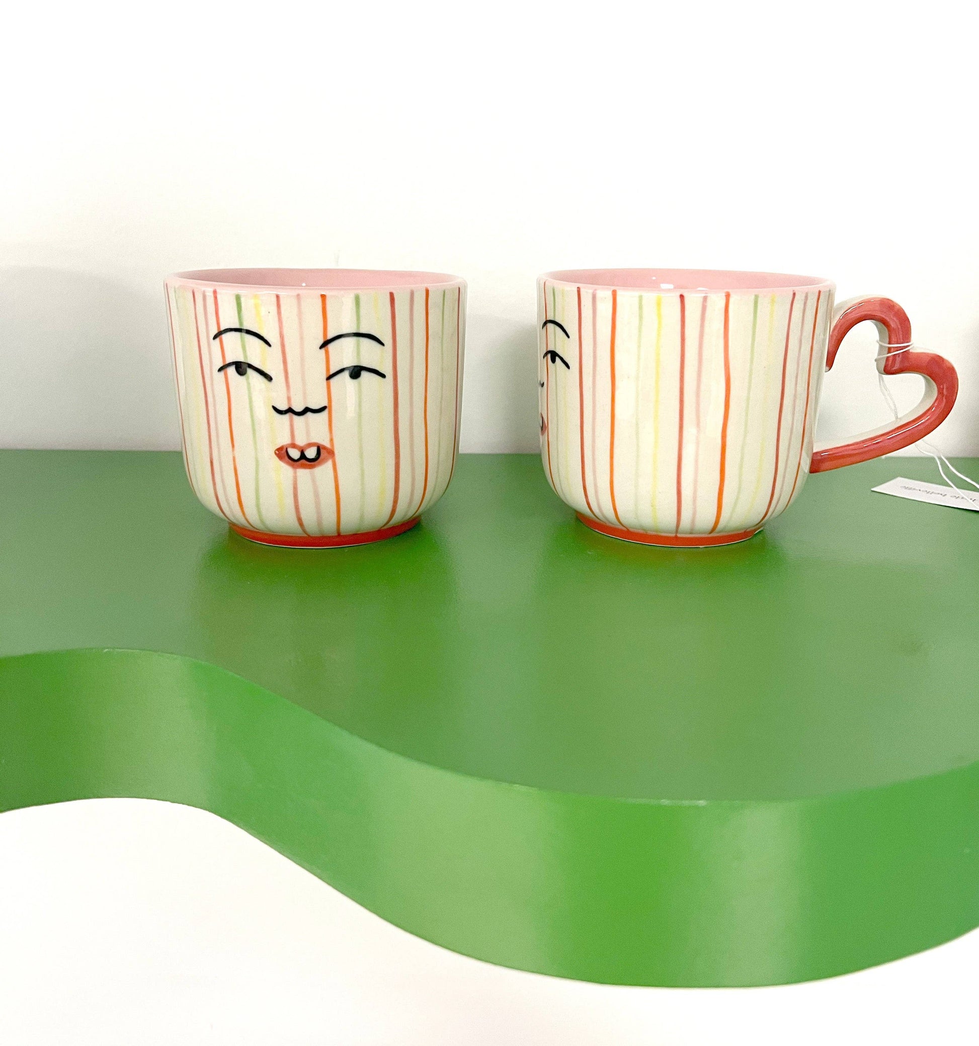 Designed in-house at My Little Belleville, these mugs are a colorful way to sneak in a bit of personality into your life. A rainbow pattern of face profiles decorate the outside, with a pretty vintage eggshell blue inside and on a heart-shaped handle. Durable and made in India. Details: 5X4 inches Microwave and dishwasher safe.