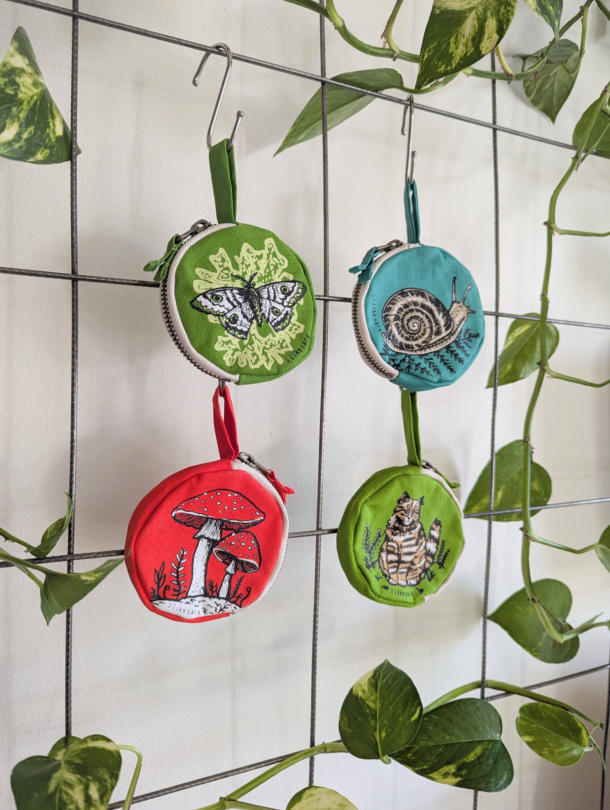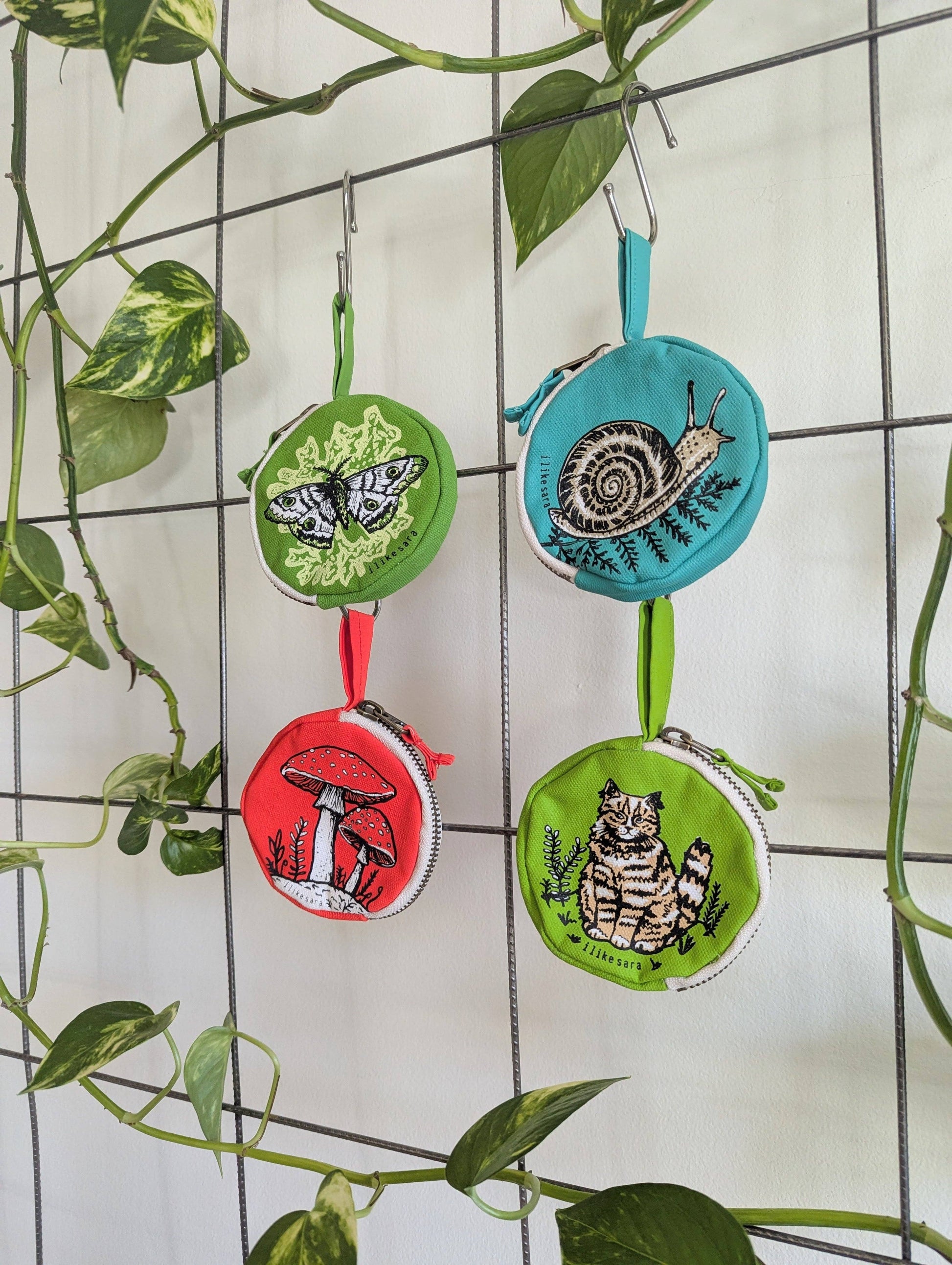 This snail pouch will happily store your spare change, ear buds, travel sewing supplies, on-the-go candy stash, etc! Hand-screenprinted in teal, black, tan, and white inks onto cotton canvas, this little pouch will help corral your small things and look cute doing it. Featuring a water-resistant lining, metal zipper (with fabric pull), and carrying loop, this pouch design is based on an original illustration by ilikesara / Sara Schalliol-Hodge.