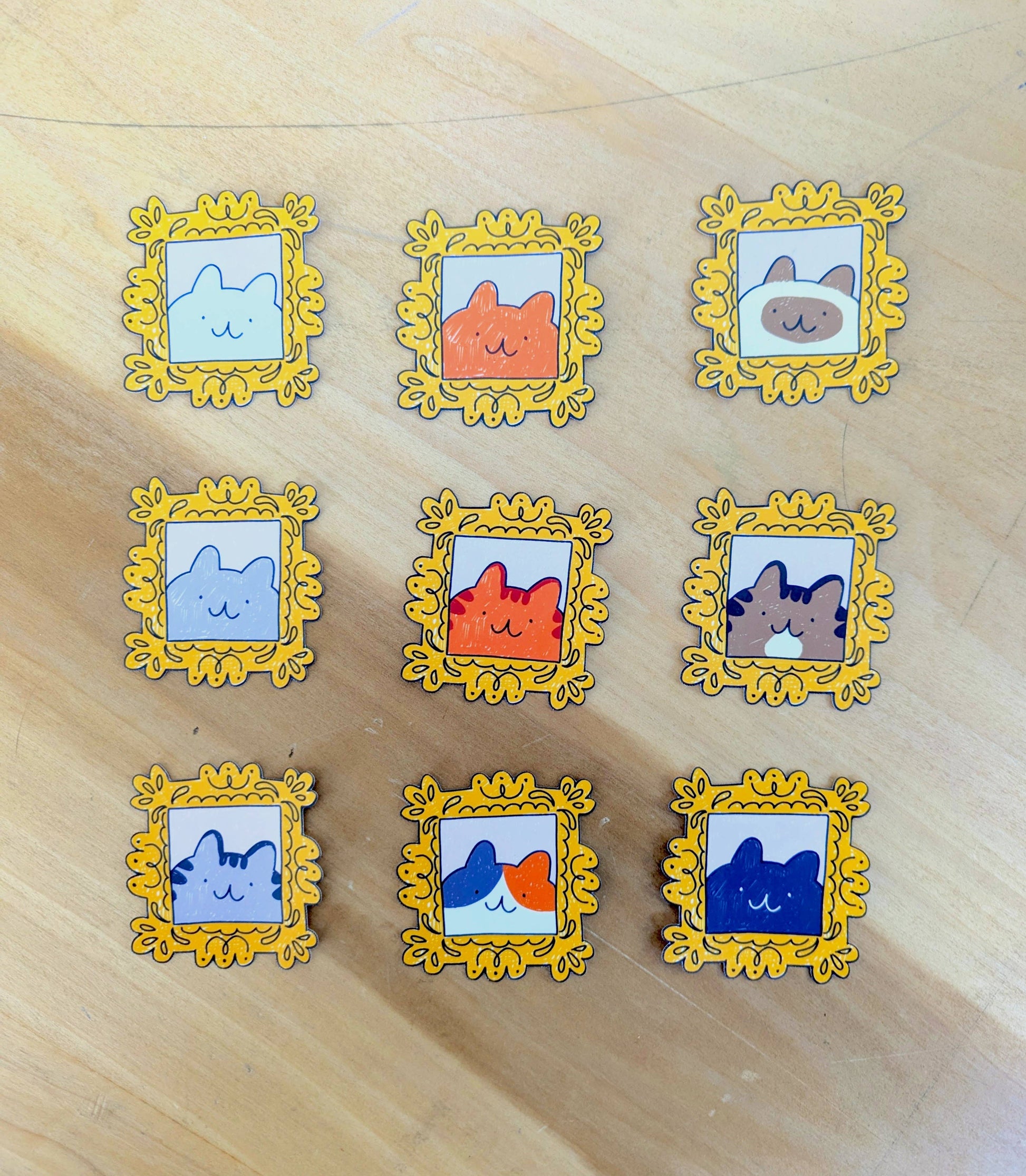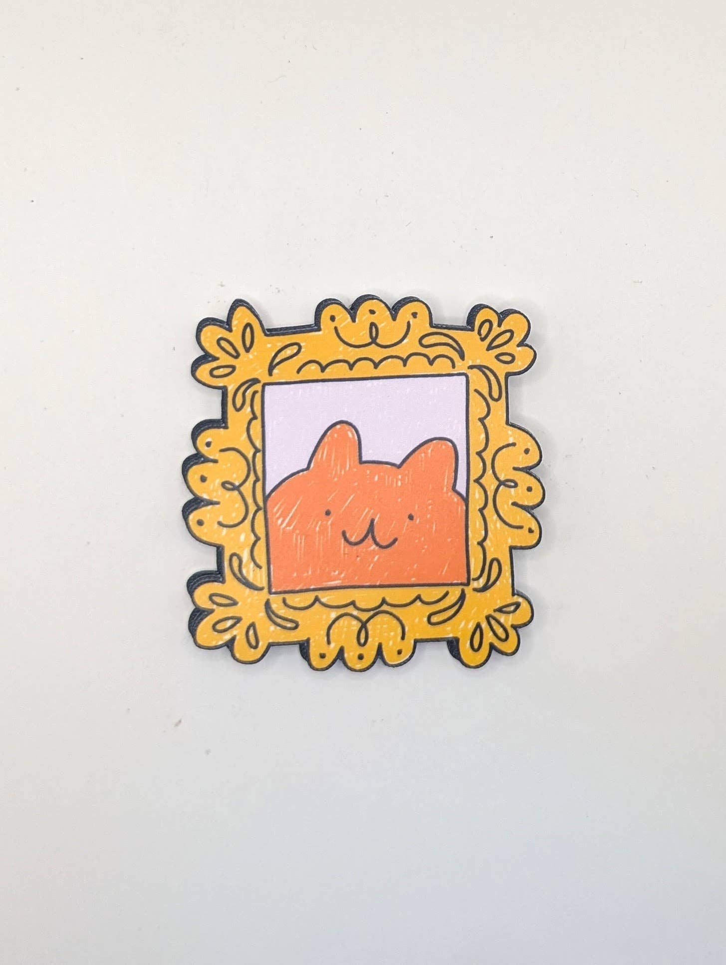 Add a dash of whimsy to your laptop, water bottle, or journal with these Framed Cat Portrait Vinyl Stickers! Each sticker features a scribbly, ornate gold frame showcasing a cute cat painting, perfect for cat lovers and art lovers alike. These waterproof vinyl stickers are durable and ready for daily use, with 9 color variations to match your mood or your cat’s fur: white, grey, grey tabby, orange, orange tabby, calico, Siamese, brown tabby, and black.