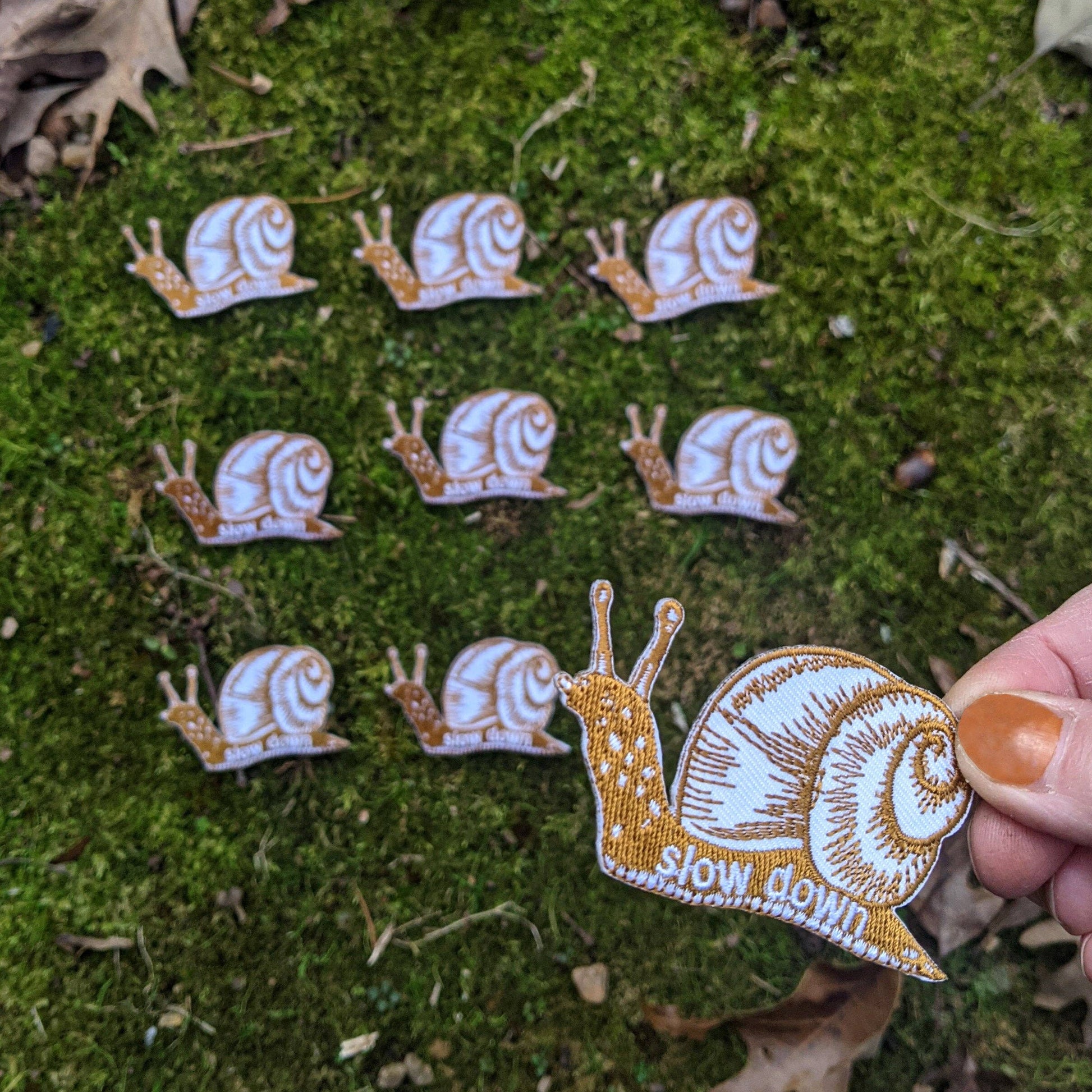 Iron-on patch | slow down snail - brown 1.6" x 2.6"