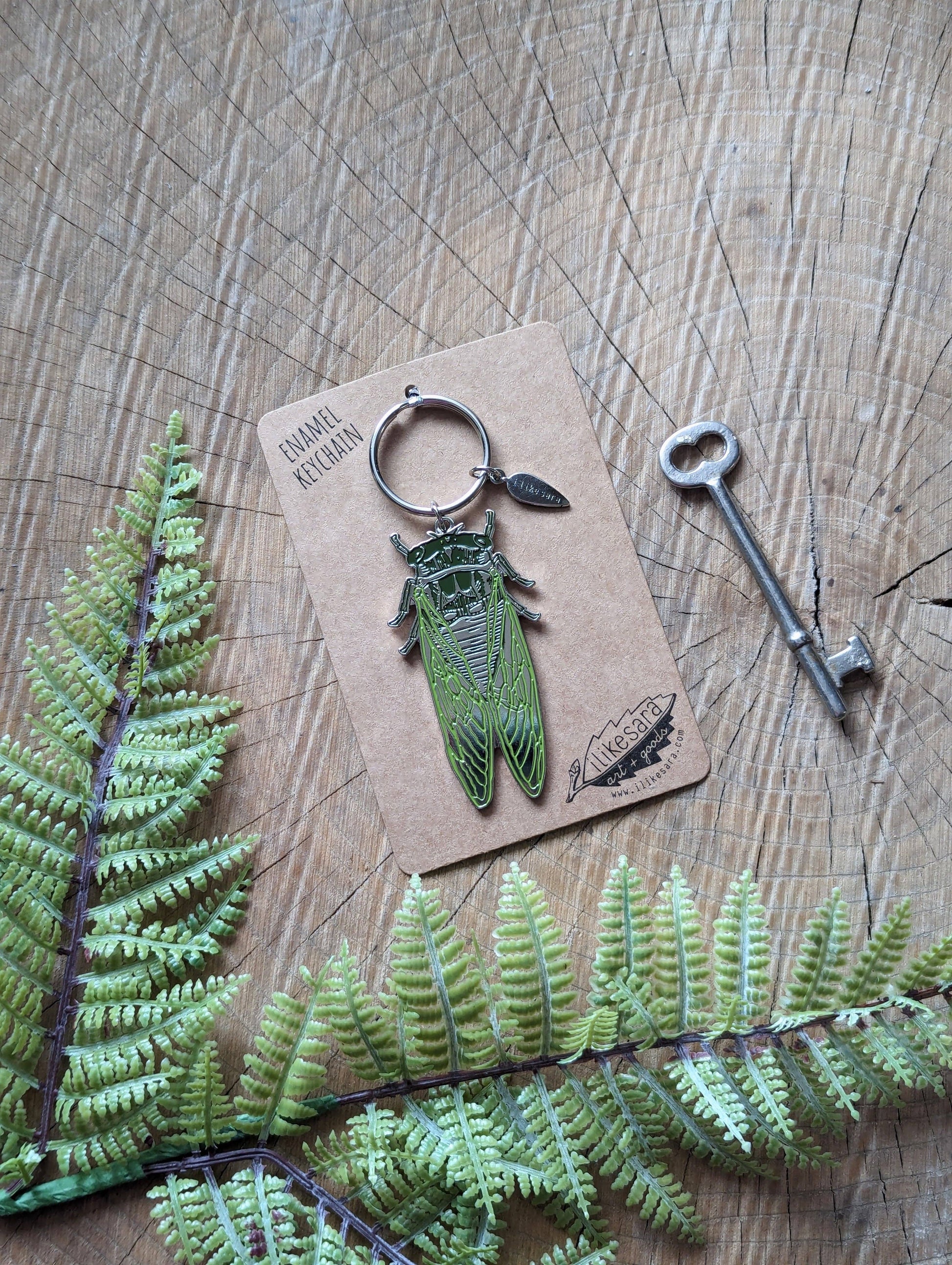 A larger than life-sized cicada to bring insect vibes along with your keys. This silver metal enamel keychain is durable and functional with a split ring for attaching to your keys and a little "ilikesara" leaf charm. Based on an illustration by ilikesara / Sara Schalliol-Hodge and inspired her childhood in Georgia and those loud summer nights filled with cicada songs.