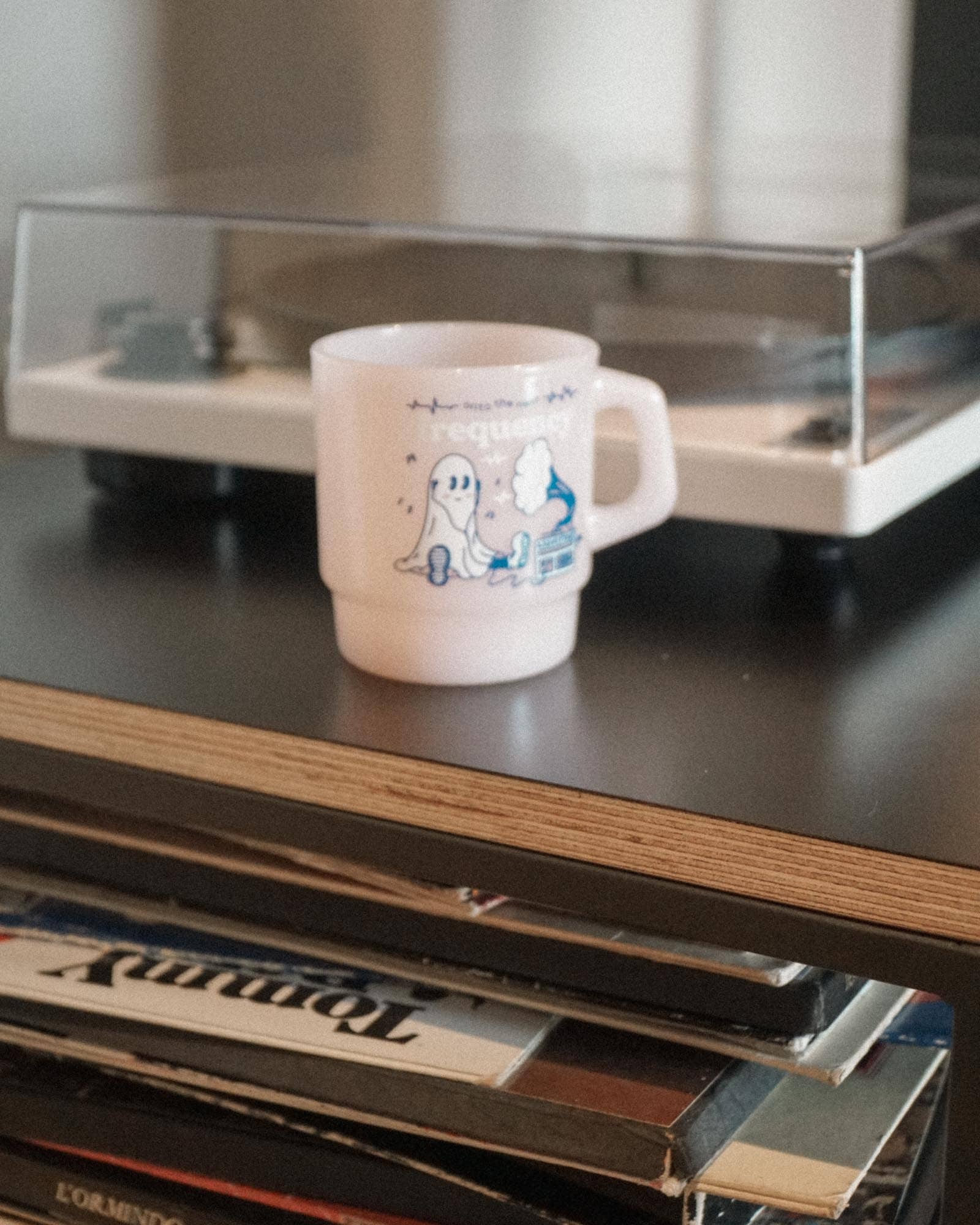 This mug is part of our spooky diner mug collection. Join this cute ghost in the next frequency and listen to some tunes on an old-fashioned gramophone.