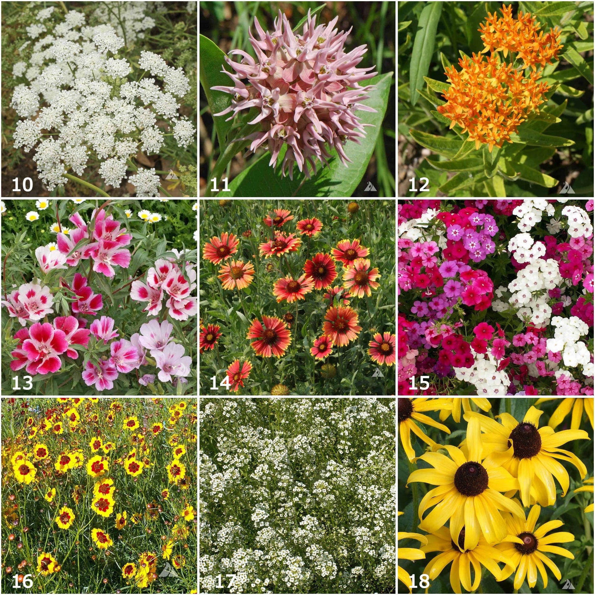 Flowers. (1) California Poppy, (2) Siberian Wallflower,(3) Perennial Lupine, (4) Tall Blue Cornflower, (5) Lance-Leaved Coreopsis, (6) Purple Cornflower, (7) Dwarf Cosmos, (8) Sweet William Pinks, (9) Gayfeather, (10) Bishop’s Flower, (11) Showy Milkweed, (12) Butterfly Milkweed, (13) Dwarf Godetia, (14) Indian Blanket, (15) Annual Phlox, (16) Plains Coreopsis, (17) Sweet Alyssum, (18) Black-Eyed Susan.