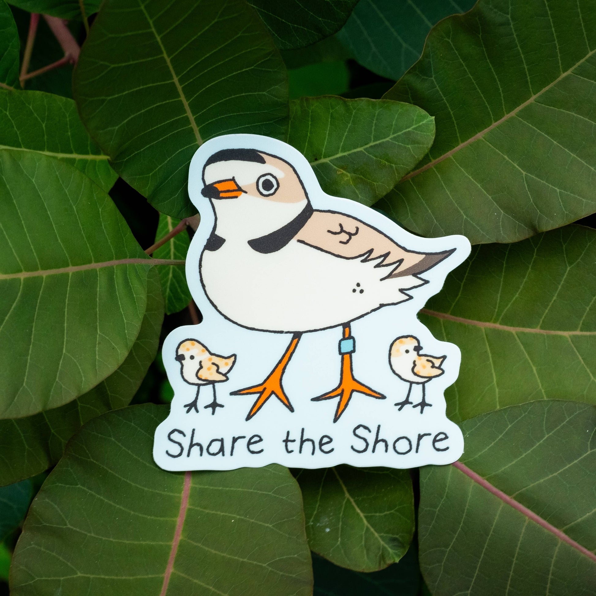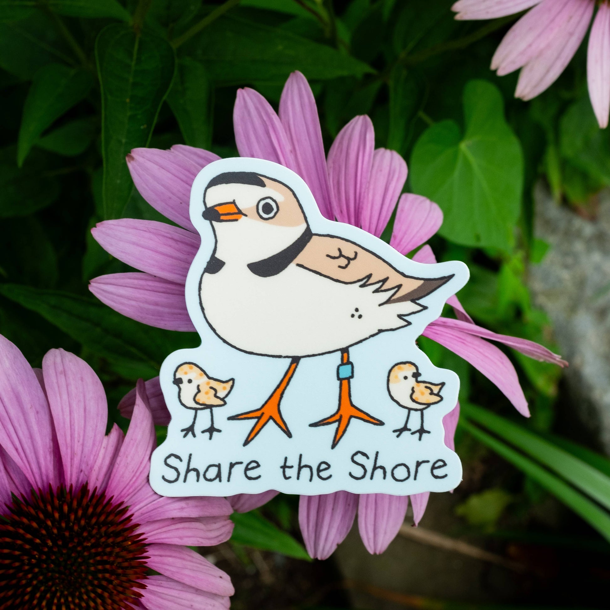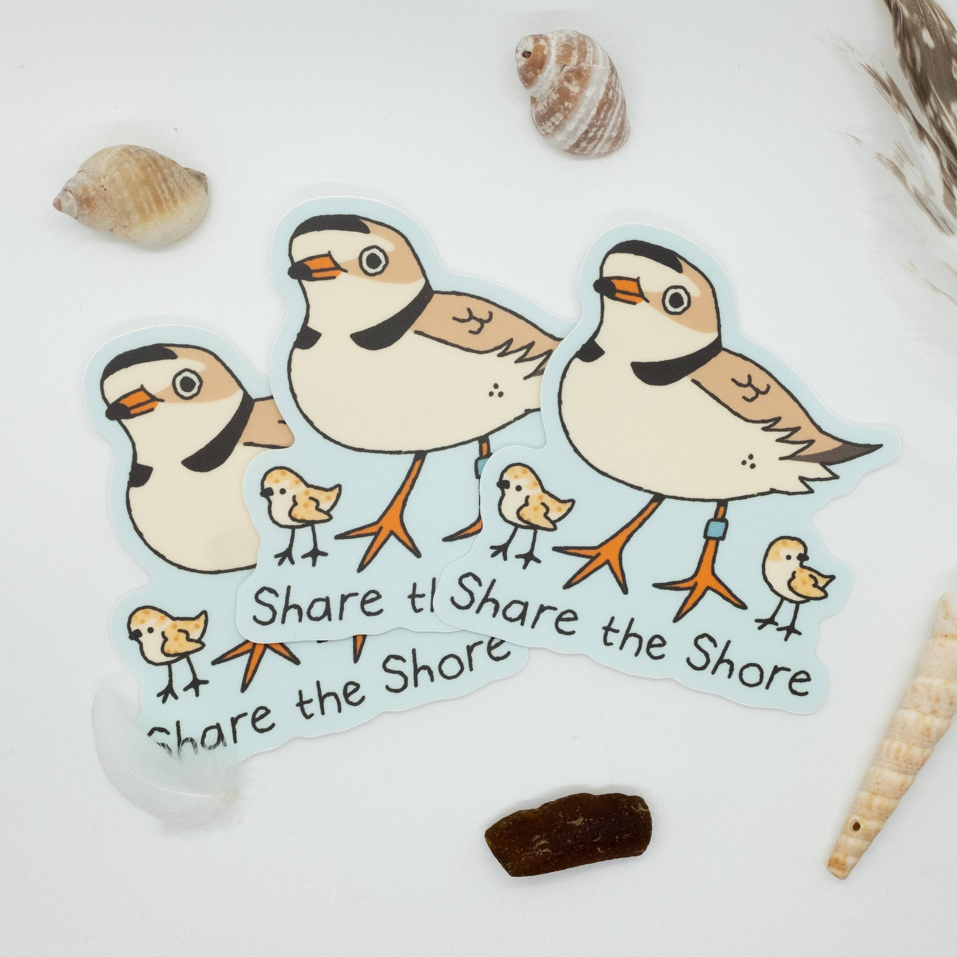 3" matte vinyl sticker of a piping plover and it's chicks, to remind you to share the shore!