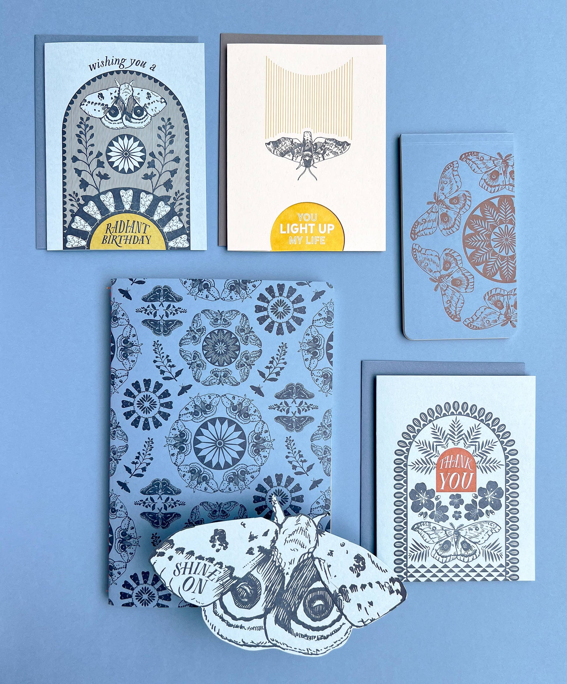 • original illustration letterpress printed in midnight blue and golden yellow ink on light gray 100# cardstock