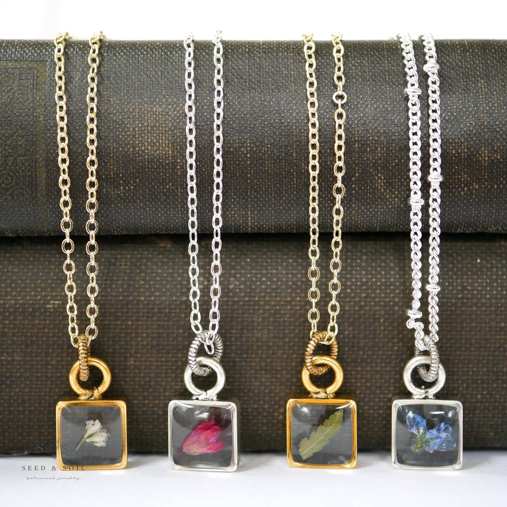 Our Tiny Square frame is a minimal and classic piece. Available with either a tiny real Fern, Coral Bell, or a single Forgetmenot flower.