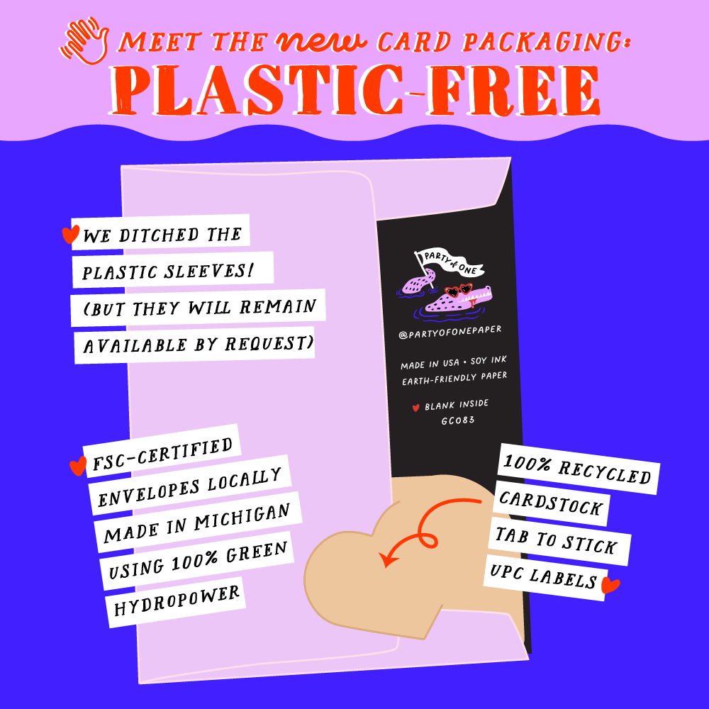 π¬ 2025 UPDATE To care for our oceans and wildlife, all cards now come in plastic-free packaging by default.Β π©· PRODUCT OVERVIEW β₯ 4.5" x 5.25" β₯ blank inside β₯ eco-conscious β₯ made in USA π PACKAGING OPTIONS β₯ plastic-free (default): unsleeved with a paper tab for price stickers β₯Β π EARTH-FRIENDLY INFO β₯ cards β’ sustainably-sourced paper β’ soy ink β₯ envelopes & paper tabs β’ locally made at family-operated mill on the St. Joseph River β’ produced using 100% green, renewable, hydroelectric energy β’ special care taken for the river's ecosystem, such as a fish ladder to allow safe passage of migrating fish β’ FSC certified paper β’ paper tabs are 100% recycled