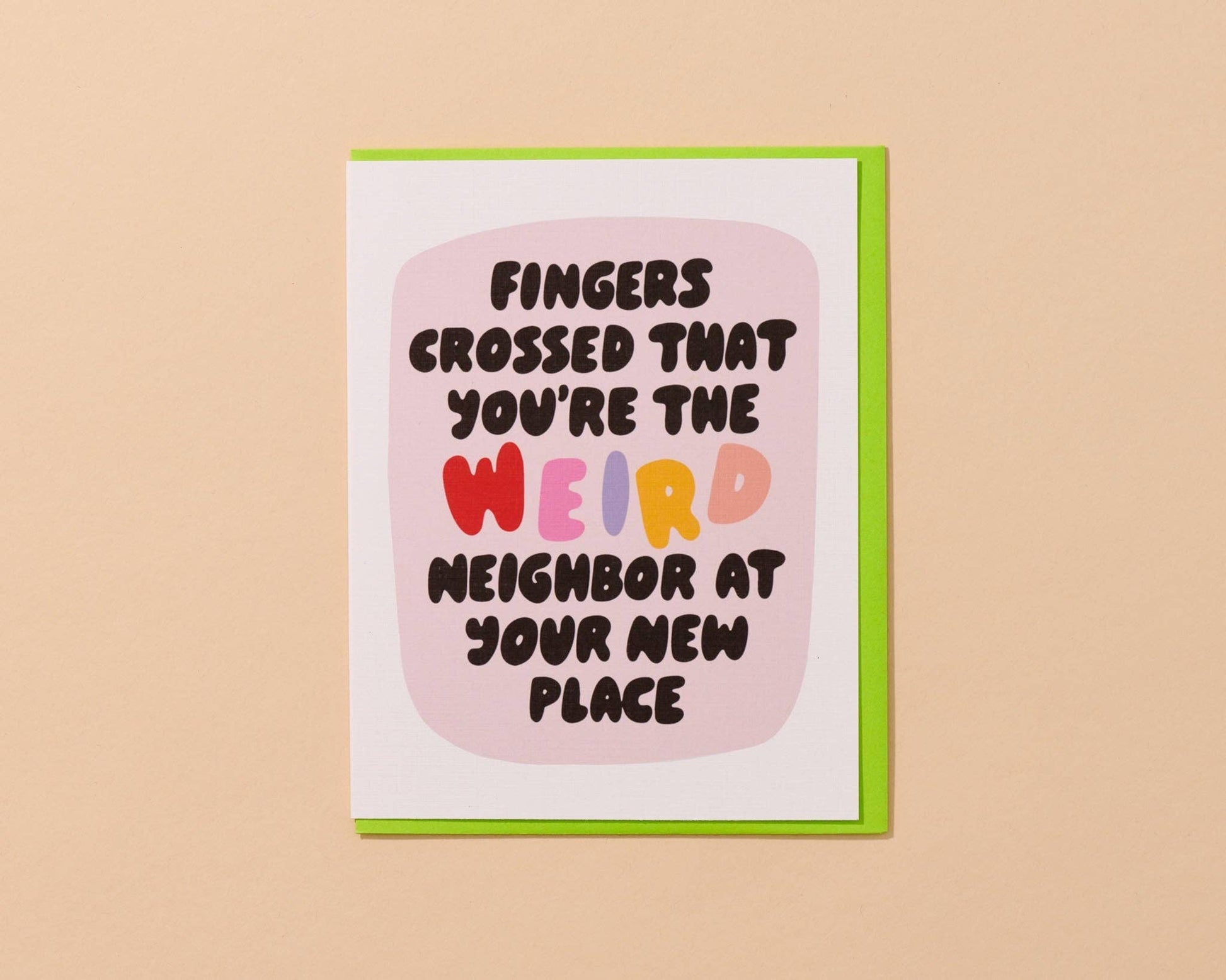 • Card reads, “Fingers crossed that you're the weird neighbor at your new place”