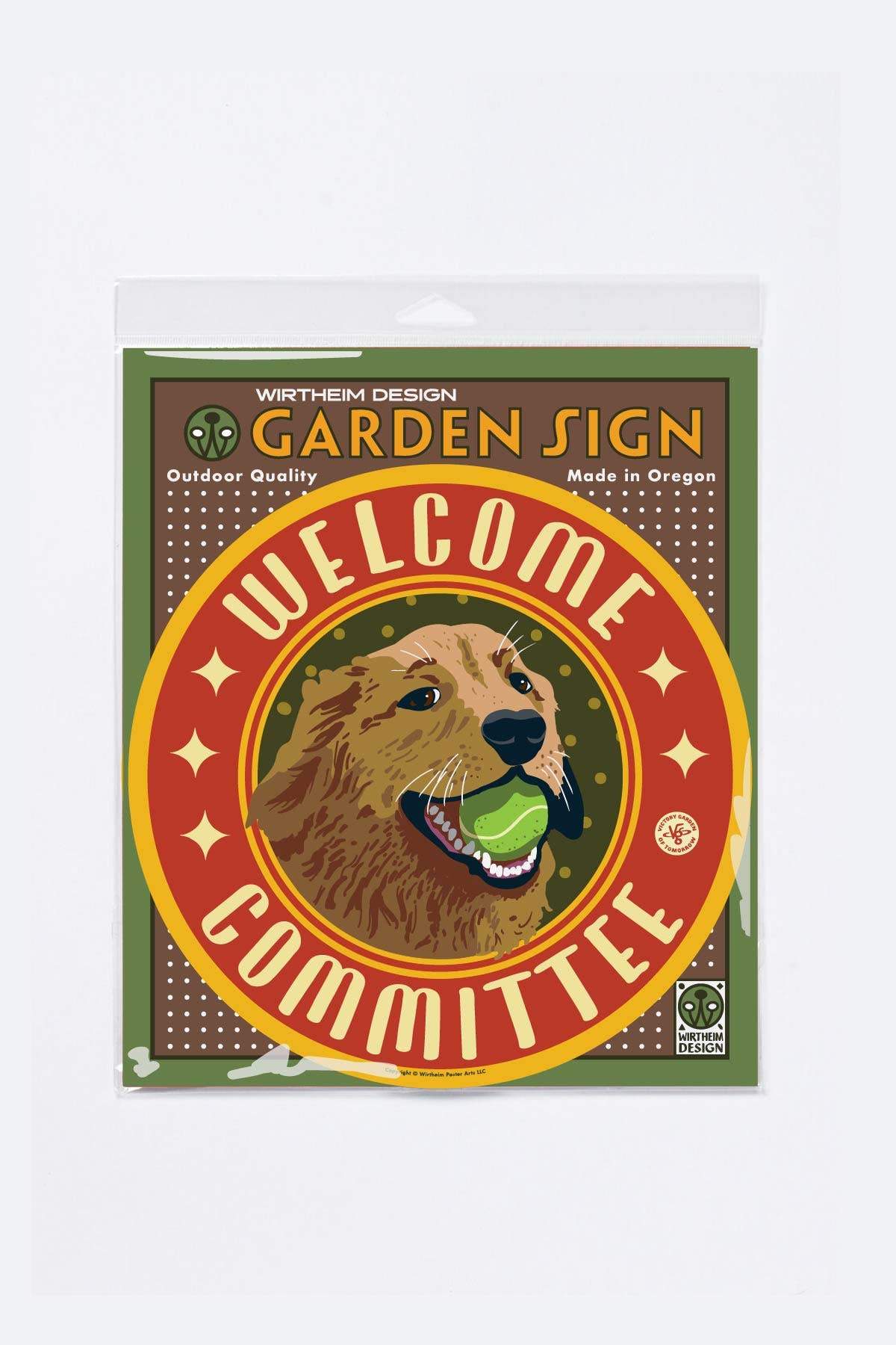 Our best friend and faithful companion is ready to say hello! Let visitors know that they will be greeted properly by a motivated welcoming committee. Illustrated here is a Golden Retriever with a slimy tennis ball for you. Made of a composite aluminum and polyethylene, and printed with a hard-cured ink, this durable sign will last for years outside and in the weather. It will look fine on a stake, on the shed or on the barn. These are something best suited for those who love the company of plants, birds and bees. Garden Signs from the V.G.o.T. are designed to engage your neighbors and increase attention toward the health, vitality and enjoyment of your outdoor spaces. Predrilled for mounting holes, centered. Screws included. SIZE: 9 in. dia. MATL: Aluminum-polyethylene sign panel OPTIONAL: 24". PRINTED in Portland, Oregon